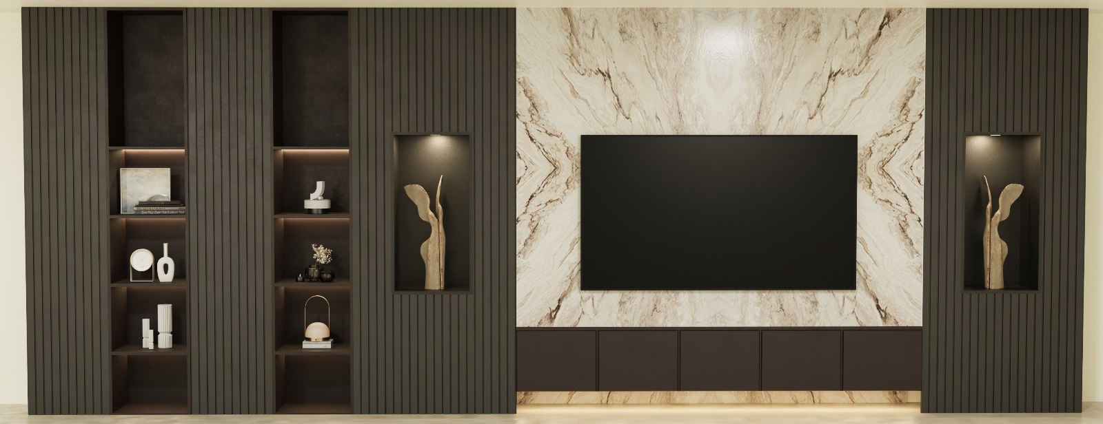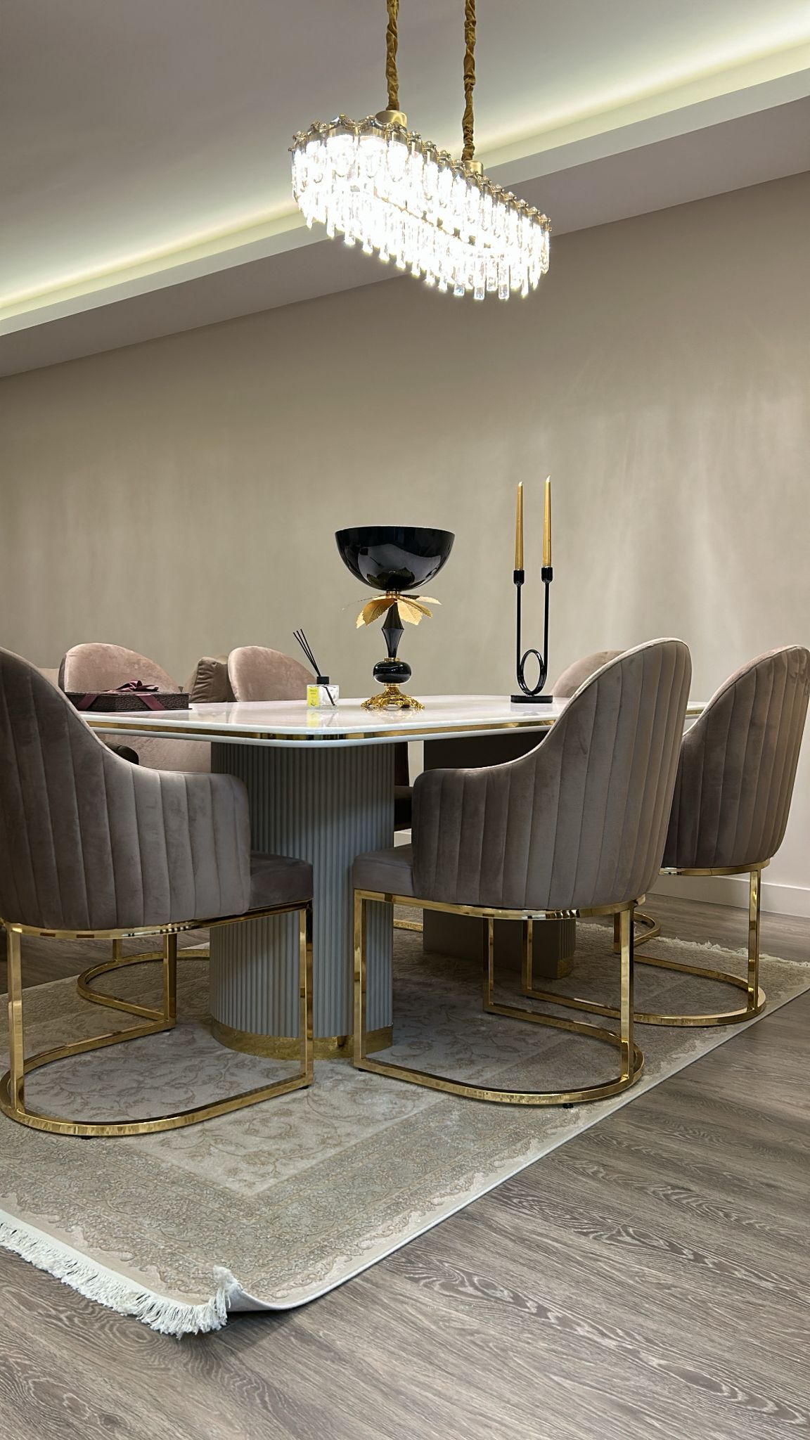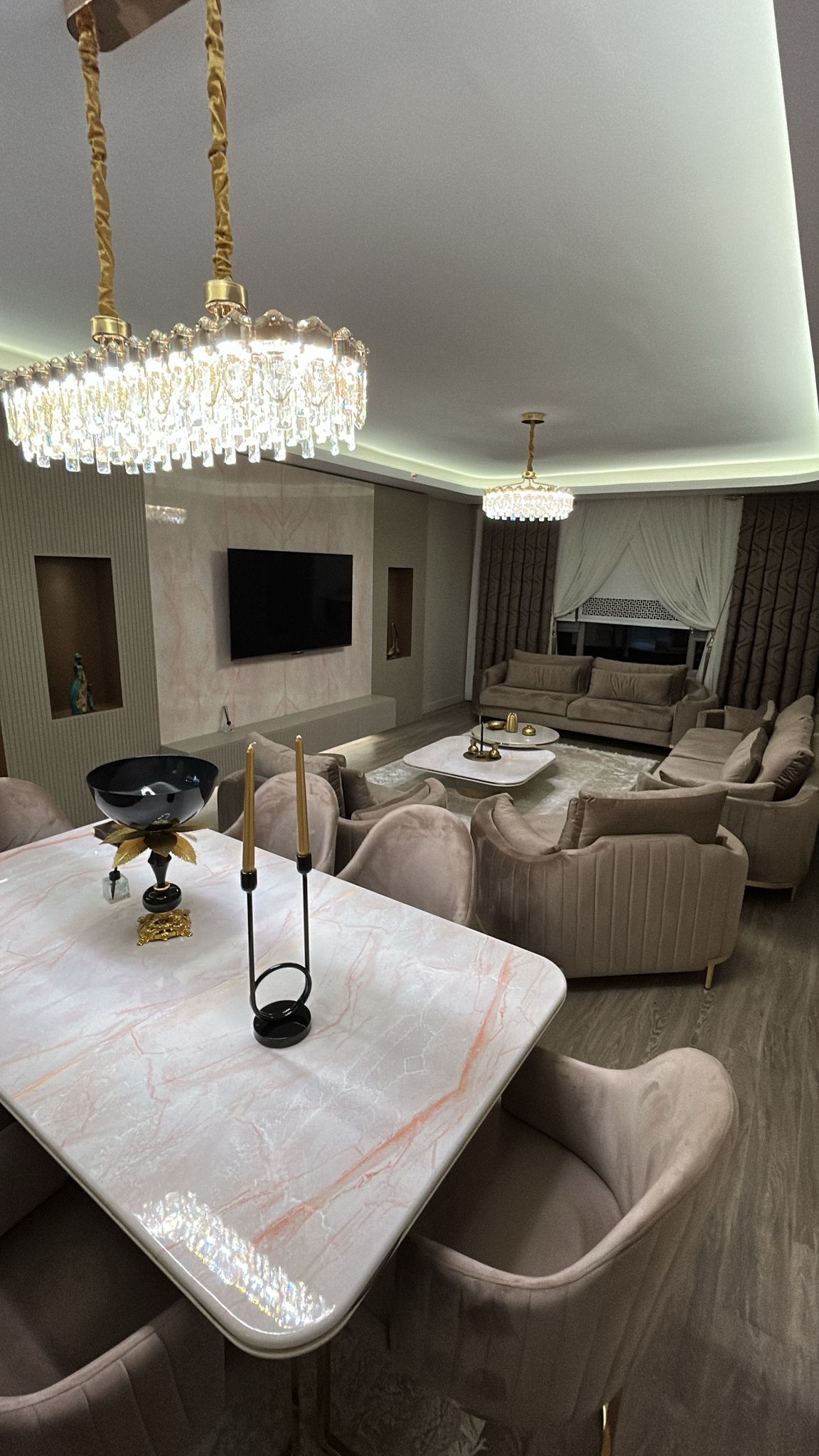 Kahan Furniture Design imzalı Yaşamkent projesi, modern yaşamın gerektirdiği konforu ve sofistike lüksü bir arada sunan bütüncül bir yaşam alanı tasarımıdır. Mekânın ana estetik dili, nötr bej ve kahve tonlarının zengin altın metal detayları ile dengelenmesi üzerine kurulmuştur. Salon ve yemek odasının birlikteliği, mermer dokuların (özellikle pembe damarlı TV ünitesi paneli ve yemek masası yüzeyi) sunduğu ihtişam ile güçlendirilirken, duvarlarda kullanılan lambiri paneller (kahverengi veya bej), niş detayları ve gizli aydınlatmalar sayesinde mekana derinlik ve katmanlı bir doku zenginliği katılır. Yemek masası ve sandalyelerde görülen özel tasarım altın detaylı metal ayaklar ve kadife döşemeler, Art Deco esintilerini çağrıştıran güçlü bir lüks algısı yaratır. Büyük, kristal ve altın detaylı avizeler, hem yemek hem de oturma alanlarını taçlandırarak mekânın tamamında homojen ve görkemli bir aydınlatma sağlar. TV ünitesi ve dresuar gibi ünitelerde de devam eden lambiri dokulu alt paneller ve altın çıta detayları, Kahan Furniture Design’ın proje genelindeki titiz ve yüksek standartlı işçiliğini ve tasarım bütünlüğünü gözler önüne serer.