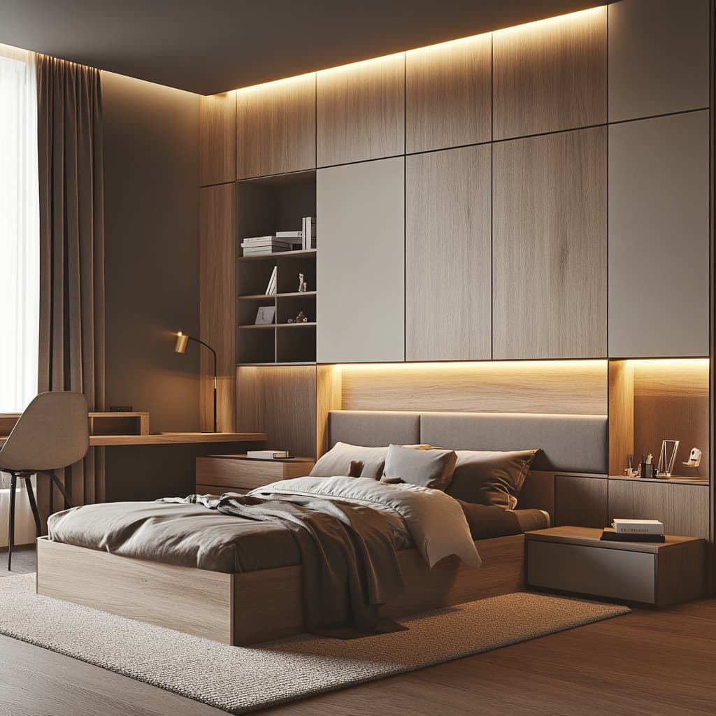 Linear Calm çocuk yatak odası, net çizgiler ve dengeli yüzeyler üzerine kurgulanmış modern bir mekân anlayışı sunar. Duvar boyunca devam eden yatak başlığı ve depolama elemanları, mekânda sade ve bütüncül bir görünüm oluştururken gizli aydınlatmalar ortama yumuşak bir derinlik kazandırır. Nötr renk paleti ve ahşap dokular, odanın sıcak ve sakin bir atmosfer kazanmasını sağlar. Linear Calm, görsel karmaşadan uzak, düzenli ve konforlu bir yatak odası arayanlar için zamansız bir yaşam alanı sunar.